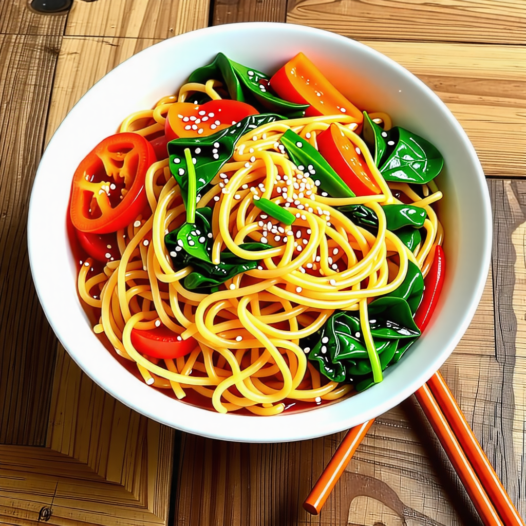 시금치는 깨끗이 씻어 끓는 물에 10초 정도 데친 후 찬물에 헹궈 물기를 짜고, 먹기 좋은 크기로 썹니다. 당근은 얇게 채 썰고, 양파는 가늘게 슬라이스합니다. 표고버섯은 기둥을 제거하고 얇게 썹니다. 파프리카는 씨를 제거한 후 채 썰어줍니다.