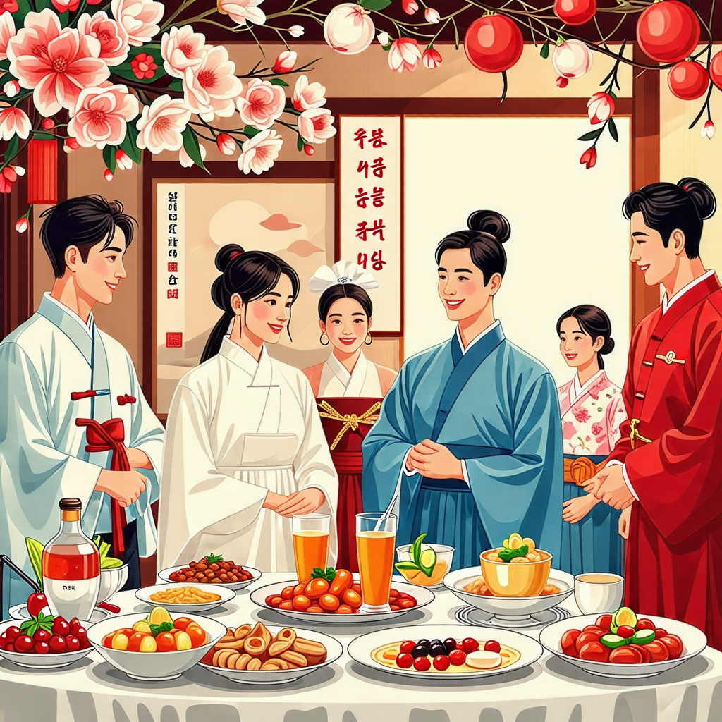 - 자리 배치는 예비 부부가 중간에 앉고 양가 부모님이 서로 마주 보게 앉는 방식이 일반적입니다.